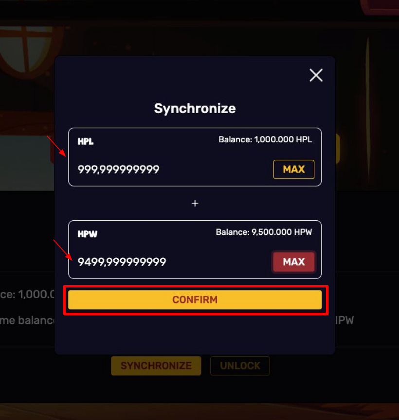 Enter the amount of $HPL and $HPW to synchronize, then click “Confirm” to complete.