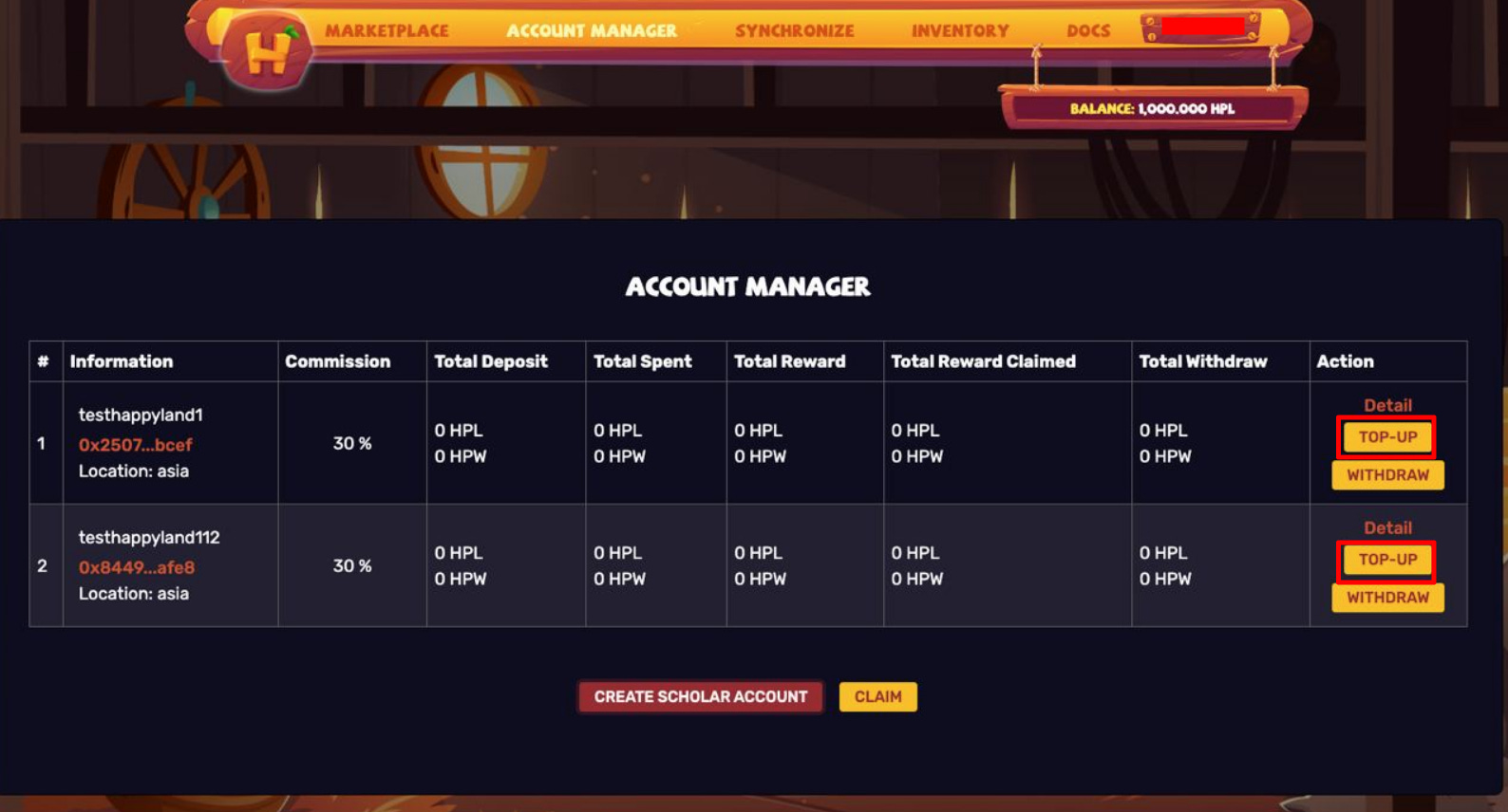In “Account Manager”, you can top up $HPL and $HPW for each Scholar account by clicking “Top-up”. We recommend you do this so each Scholar can perform any initial actions needed to start playing the game.
