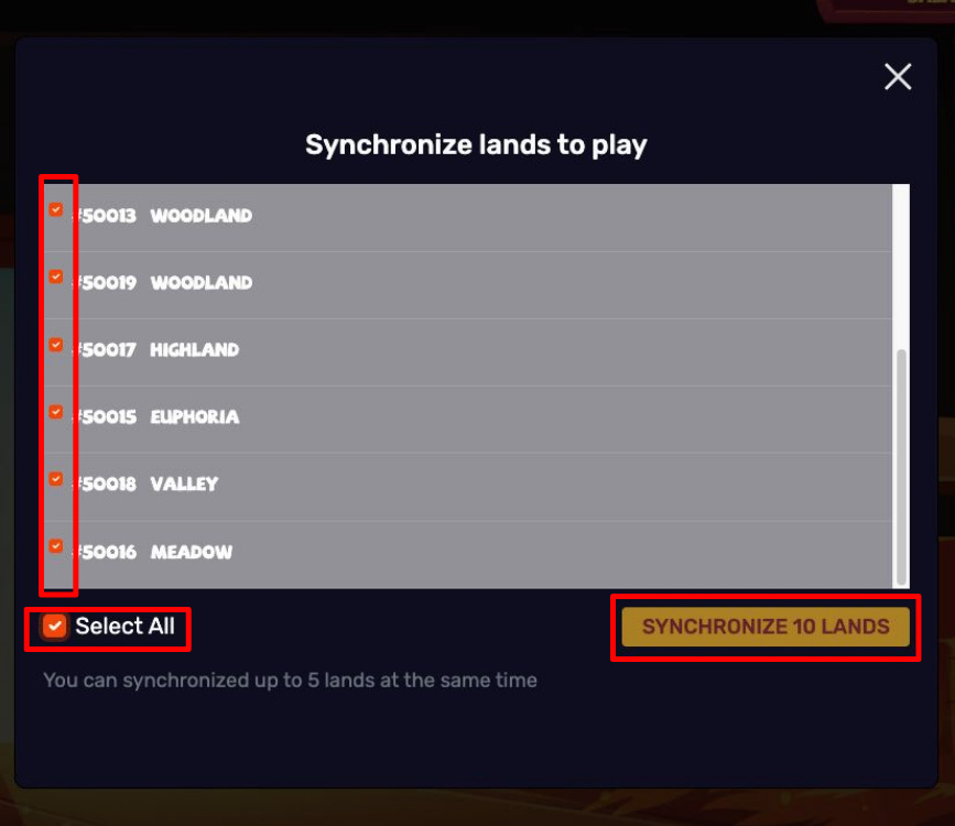 On the Synchronize Lands window, choose which lands to synchronize, then press “Synchronize”. You can sync up to 5 lands at a time.