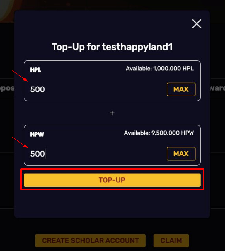 Enter the amount of $HPL and $HPW to top-up for the Scholar account, then click “Top-up” to complete.